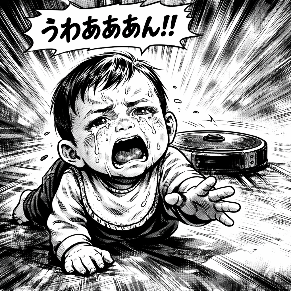 生後10ヶ月のある日、好奇心旺盛なさく坊は、天敵ルンバに向かっていき、ルンバをペンペン叩き始める。