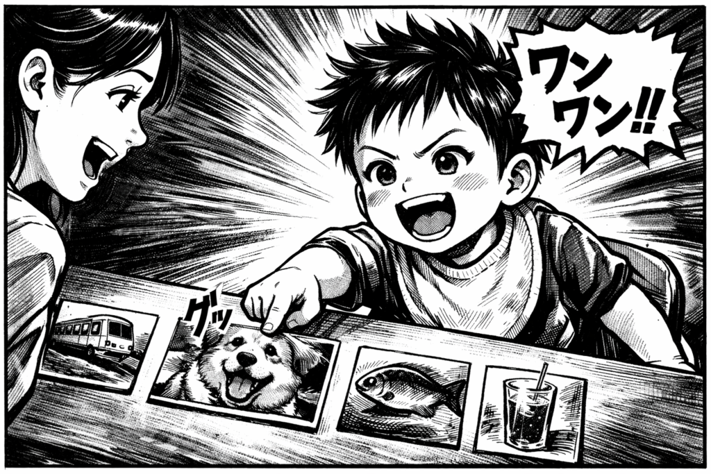 さく坊は犬の写真を指さし「わんわん!」と回答。