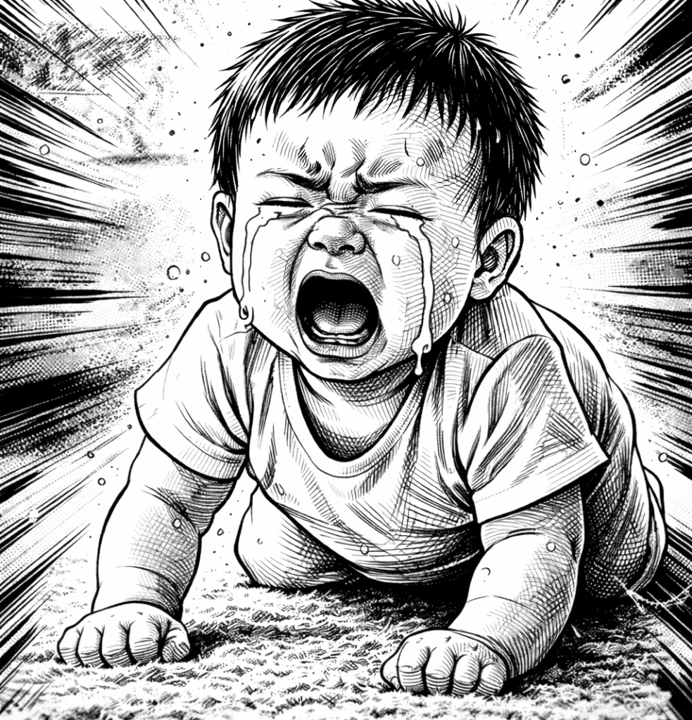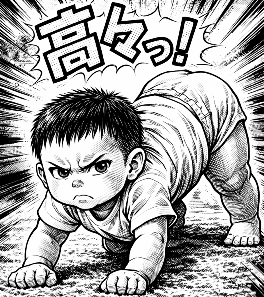 お尻を高々と上げ、一歩、二歩進んで潰れる。